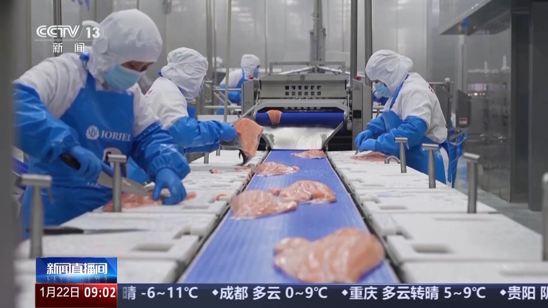 总台记者 佘利霞:我现在来到了位于湖北鄂州临空经济区内的三文鱼智能加工基地。在我旁边的这条生产线,它是通过激光定位和机械臂的协同作业,实现三文鱼的高效加工。它每分钟可以加工处理25条三文鱼,每个小时可以处理上千条,效率是传统人工的20倍以上。