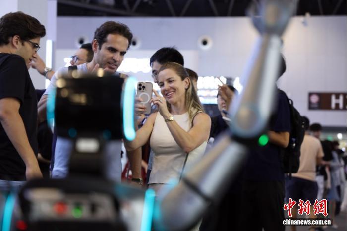 2025年7月,在上海举办的2025世界人工智能大会上,一款中国制造的机器人吸引外国观众。中新社记者 汤彦俊 摄