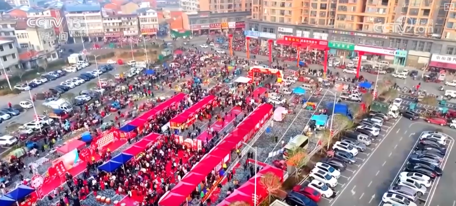 在湖北随县厉山镇,集文化展演、年货展销、趣味体验于一体的庙会也热闹开场。活动现场锣鼓喧天,舞龙舞狮腾跃翻飞。年货展销区人气火爆,随县本土特产丰富多样,满足市民“一站式”购齐年货的需求。活动将持续至2月13日,为进一步激发消费活力,活动中还将累计发放100万元消费券。