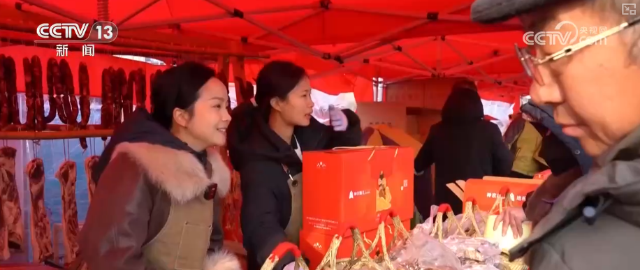 此外,在年货大集上,牛羊猪鸡、新鲜蔬菜等商品,都是农民自产自销的,吸引着市民来这里置办年货,体验“年味”。