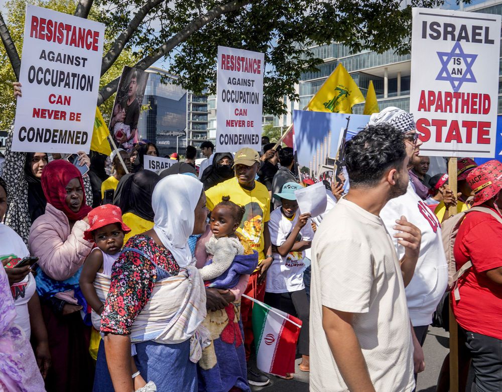 在位于南非约翰内斯堡的美国驻约翰内斯堡总领馆外,民众集会抗议美以对伊朗动武。