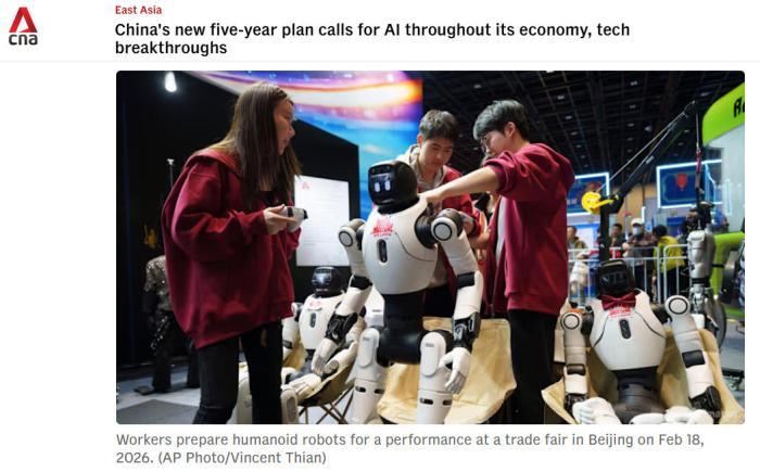 新加坡《联合早报》报道称,中国多家人形机器人公司在春晚舞台上的武术表演吸引全球目光,相关产业获得舆论高度关注,这股热潮延续至2026年中国全国两会上,不少人工智能相关的企业人士在会场外成为媒体格外关注的对象。