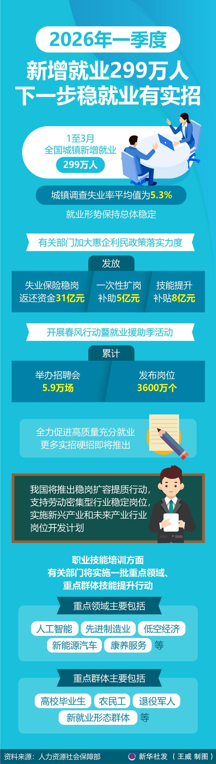新华社北京4月28日电题:一季度新增就业299万人 下一步稳就业有实招