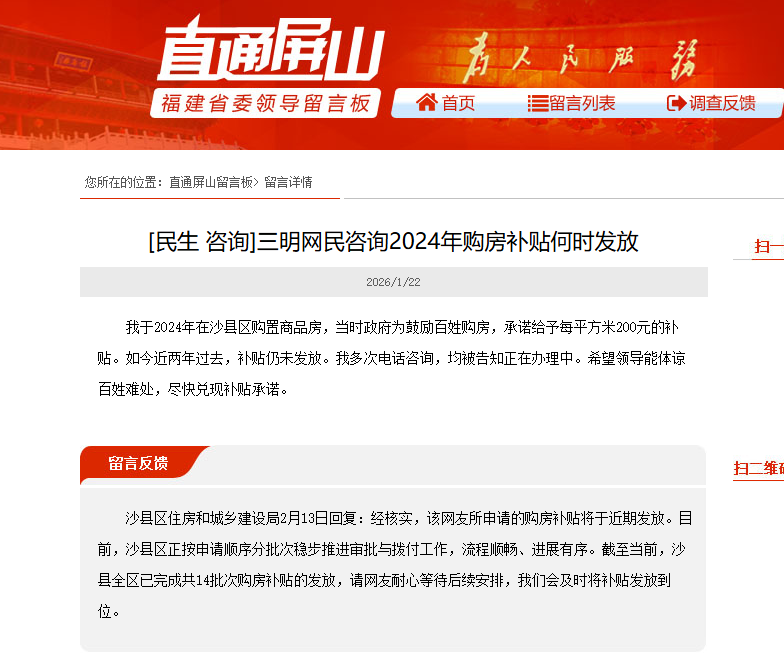 日前,网友杨先生反映,其在2024年3月份购置了位于三明沙县区新城西路的中茵·观澜云顶小区一套127平方米的商品房,购房补贴迟迟未收到。在东南网的跟踪报道下,该网友购置商品房的补贴已全额收到。
