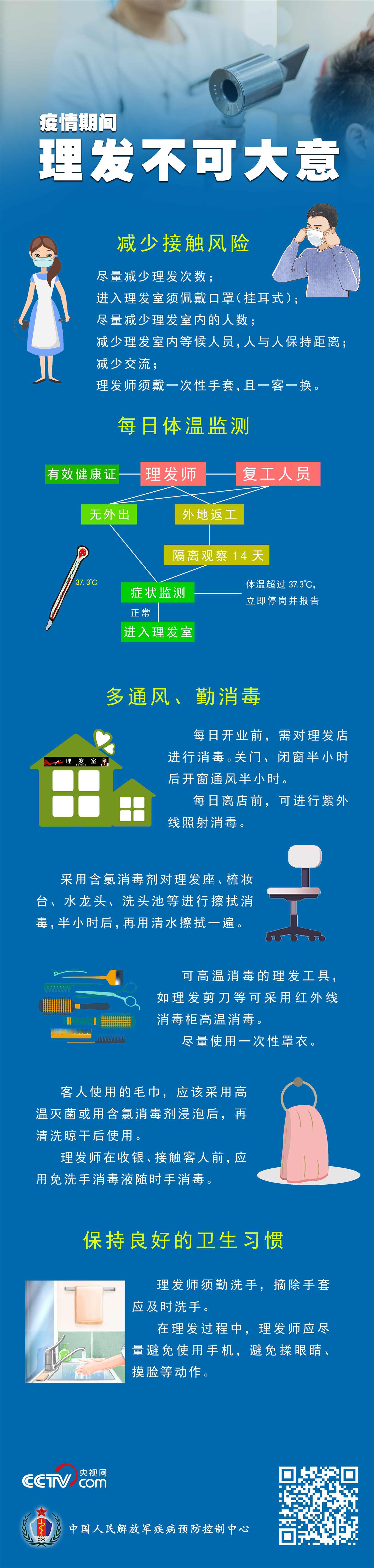 央视网消息:随着复工复产潮的到来,以及居家隔离时间的延长,人们的理发需求变得越来越迫切。为避免疫情传播风险,解放军疾病预防控制中心专家提醒您,外出理发不可大意,需要注意这几点。(石华、杜建国)