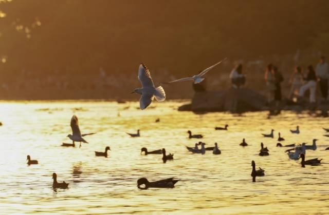 深圳,日落时分,大批黑脸琵鹭、斑嘴鸭、反嘴鹬等越冬候鸟陆续抵达深圳湾畔。