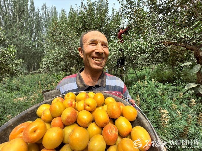 7月8日,果农在皮山县阔什塔格镇克什拉克村杏园搬运采摘的杏子。石榴云/新疆日报记者约提克尔·尼加提摄