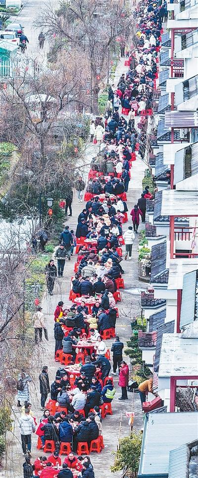 浙江建德市莲花镇戴家村,当地群众与外地游客品尝百家宴。