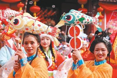 安徽合肥市新春文化庙会的鱼灯巡游。