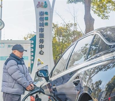 我国建成全球最大电动汽车充电网络。这是一位车主在江苏泰州市的一个电动汽车快充站内为车辆充电。