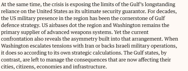 文章认为,美国升级与伊朗的对抗,是按照自身战略盘算作出的选择,但安全、经济和基础设施层面的后果,却主要由海湾国家承担。瓦基勒直言,这场战争正在暴露海湾国家长期依赖美国安全保护伞的局限:当华盛顿升级局势时,海湾国家不得不面对落到本国城市、民众、经济和基础设施上的现实代价。