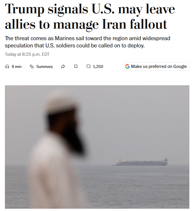 《华盛顿邮报》还指出,更具讽刺意味的是,特朗普政府是在未充分协商盟友的情况下发动这场行动,如今却不断施压美国的“盟友们”,要求它们在霍尔木兹海峡安全问题上承担更多责任。文章直言,美国主导了局势升级,却试图把后续安保和外溢压力转嫁给盟友承担。