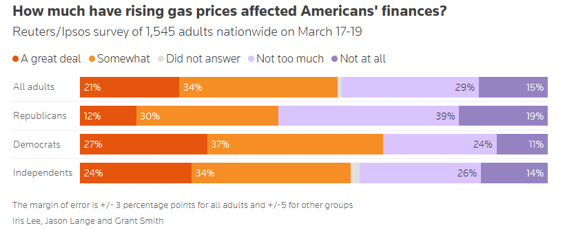 民调显示,55%的受访者表示油价上涨已经影响其家庭财务。