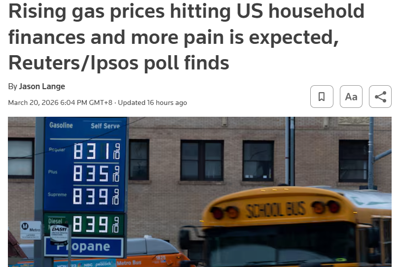 路透社3月20日援引路透社/益普索最新民调显示,随着美以伊冲突推高油价,战争带来的压力已开始直接冲击美国家庭。55%的受访者表示,油价上涨已经影响家庭财务状况,其中21%称影响“很大”,而87%的美国人预计,未来一个月油价还将继续上行。