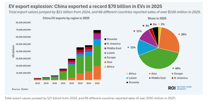 △路透社发布的中国电动汽车在全球的销售情况