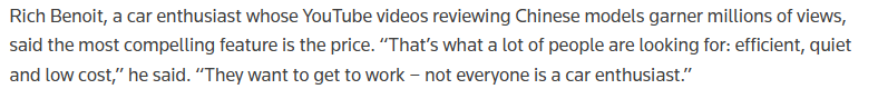 路透社援引汽车博主里奇·贝诺伊特的话说,中国电动汽车最打动普通消费者的是“高效、安静、价格低廉”。贝诺伊特在社交平台上发布的中国车型评测视频已经获得了数百万的点击量,他指出人们只是想寻找心仪的车“开车上班”。