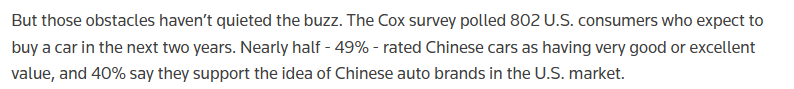 路透社援引调查数据称,美国消费者对中国汽车的接受度其实高于外界想象。全球知名汽车服务与技术公司“考克斯汽车 ”(Cox Automotive)针对未来两年有购车计划的802名美国消费者进行调查发现,49%的受访者认为中国车性价比“非常高”或“很高”,40%受访者支持中国电动汽车品牌进入美国市场。