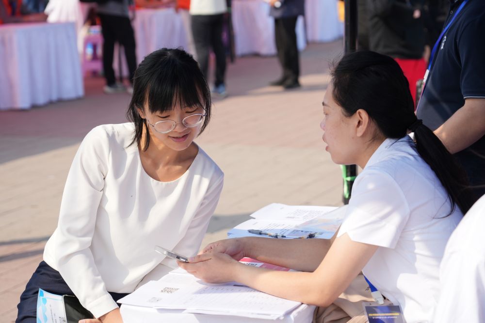 2024年9月25日,求职者(左)在招聘会现场与招聘单位工作人员交流。当日,雄安新区举办2024年河北省毕业生就业市场雄安新区专场招聘会暨河北雄安新区大型人力资源招聘会。招聘会以“稳岗就业 聚才发展”为主题,邀请京津冀地区共157家企业线下参会,提供就业岗位4783个。