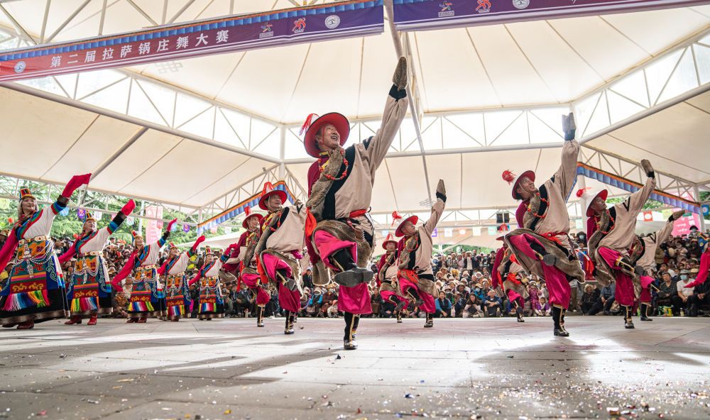 在布达拉宫脚下的宗角禄康公园举办的第二届拉萨锅庄舞大赛(决赛)现场(2024年6月14日摄)。新华社记者 丁增尼达 摄