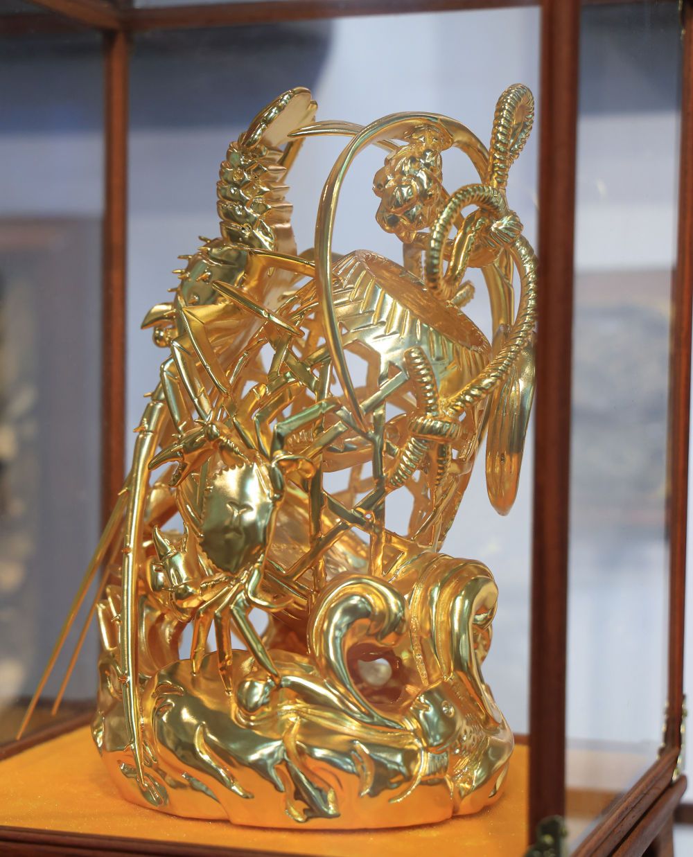 图为龙虾蟹篓题材的金漆木雕。新华社记者 毛思倩 摄 一幅潮绣《阿房宫》,12名绣工要耗时3年绣制;麦秆剪贴画里,一根孔雀羽毛上就要刻上万刀;大型木雕《甘露寺》,刻有130多个人物和30多匹马,历时23年才雕琢完成……潮州人把工夫都做在了光阴里。 今年1月,“潮绣”被正式认定为国家地理标志产品。潮州绣娘们用一根针挑出万千世界,把中式美学“绣”入婚纱礼服,成为欧美客商追捧的“爆款”。