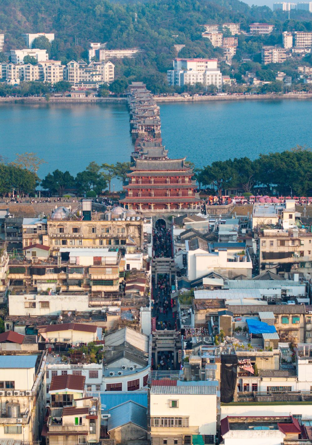 图为潮州广济桥、广济楼和潮州古城(无人机照片)。新华社记者 毛思倩 摄 这里至今保留着宋代“外曲内方,四横三纵”的街区格局,23座古牌坊连接起51条古街巷。唐代开元寺、宋代许驸马府、明清“潮式”民居和民国建筑散落其中……一步之遥,仿佛已历千年之久。 “这还是一座活着的千年古城,是主客共享的、充满烟火气的、让人身心平和的古城。”潮州市文广旅体局主要负责同志说,约2.33平方公里的古城里至今生活着5万多名居民,历史建筑、民居商铺都融合在街巷里。一墙之隔,两样风光:新城区灯火繁华、车水马龙,而古城依旧青砖灰瓦、古色古香。