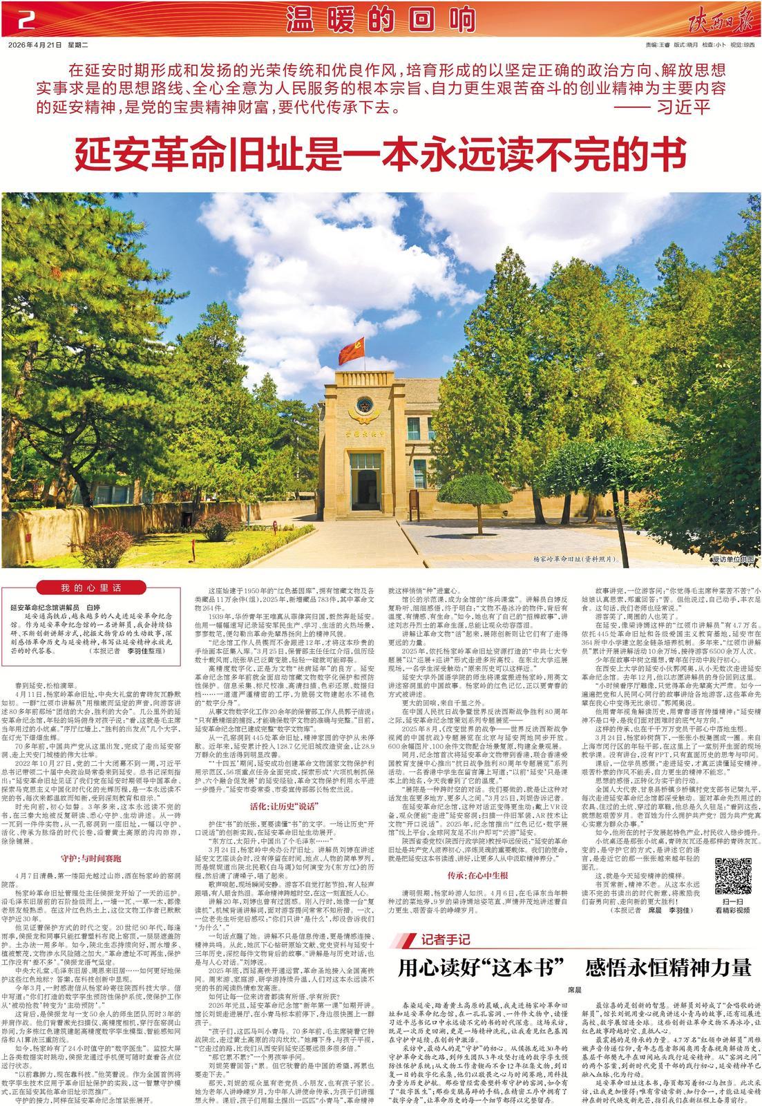3月25日,游客在延安革命纪念馆参观。 讲解让革命文物“活”起来,展陈创新则让它们有了走得更远的力量。 2025年,依托杨家岭革命旧址资源打造的“中共七大专题展”以“巡展+巡讲”形式向多所高校延伸。在东北大学巡展现场,一名“00后”学生深受触动:“原来历史可以这样近。” 同一时间,延安大学外国语学院的师生将课堂搬进杨家岭,用英文讲述窑洞里的中国故事。杨家岭的红色记忆,正以更青春的方式被讲述。 更大的回响,来自千里之外。 在中国人民抗日战争暨世界反法西斯战争胜利80周年之际,延安革命纪念馆策划系列专题展览—— 2025年8月,《改变世界的战争——世界反法西斯战争视阈的中国抗战》专题展览在北京与延安两地同步开放。600余幅图片、100余件文物配合历史影像与场景复原,构建全景观展。《黄河大合唱》沉浸式数字影像墙前,旋律随光影流动。 同月,纪念馆首次将延安革命文物带到香江之畔,联合香港爱国教育支援中心推出“抗日战争胜利80周年专题展览”系列活动。一名香港中学生在留言簿上写道:“以前‘延安’只是课本上的地名,今天我看到了它的温度。” 两个月后,专题图片展首次走进西藏赴拉萨巡展,让延安精神、抗战精神与“老西藏精神”、“两路”精神在雪域高原交融共鸣。 “展陈是一种跨时空的对话。我们要做的,就是让这种对话发生在更多地方、更多人之间。”3月25日,刘妮告诉记者。 在延安革命纪念馆,这种对话正变得触手可及:戴上VR设备,观众便能“走进”延安窑洞;扫描一件旧军装,AR技术让文物“开口说话”。2025年,纪念馆推出“红色记忆·数字展馆”线上平台,全球网友足不出户即可“云游”延安。 省委党校教授毕远佞说:“延安的革命旧址承载党的梦想和追求、情怀和担当、牺牲和奉献,是共产党人滋养初心、淬炼灵魂的重要载体。我们的使命,就是把延安这本书读透、讲好,让更多人从中汲取精神养分。” 传承:在心中生根 清明假期,杨家岭游人如织。4月6日,在毛泽东当年耕种过的菜地旁,9岁的梁诗嫣站姿笔直、声情并茂,讲述着自力更生、艰苦奋斗的峥嵘岁月。 故事讲完,一位游客问:“你觉得毛主席种菜苦不苦?”小姑娘认真思索,郑重回答:“苦。但他说过,自己动手,丰衣足食。这句话,我们老师也经常说。” 游客笑了,周围的人也笑了。笑声里,红色血脉静静流淌。 在延安,像梁诗嫣这样的“红领巾讲解员”已有4.7万名。当地依托445处革命旧址和137个爱国主义教育基地,与364所中小学深度合作,建立全链条培养机制。多年来,“红领巾”累计开展讲解活动10余万场,接待游客6500余万人次。孩子们用讲、唱、演等青春方式,讲述党中央在延安十三年的光辉历程,成为黄土高原上最动人的风景。 少年在故事中树立理想,青年在行动中践行初心。 在西安上大学的延安小伙郭闻奥,从小无数次走进延安革命纪念馆。去年12月,他以志愿讲解员的身份回到这里。 “小时候看序厅雕像,只觉得革命先辈高大严肃。如今一遍遍把党和人民同心同行的故事讲给各地游客,他们在我心中变得无比亲切。”郭闻奥说。 对他而言,回到延安,是回家,更是归心。他用青年视角解读历史,用青春语言传播精神:“延安精神不是口号,是我们面对困难时的底气与方向。”