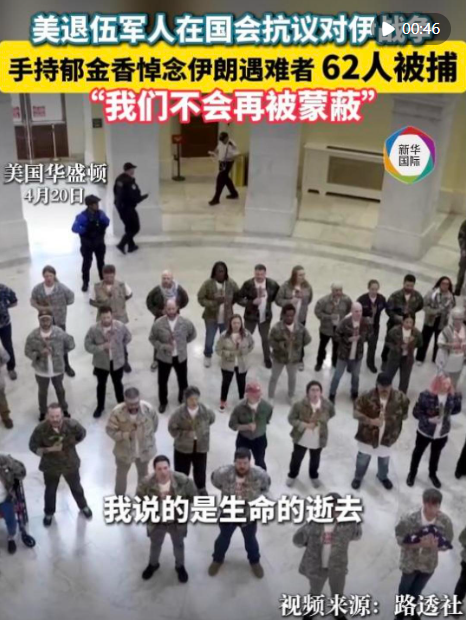 数十名美国退伍军人及其家属20日在美国会大厦举行抗议活动,呼吁特朗普政府停止对伊朗的军事行动。活动中至少62人被捕。