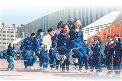内蒙古呼和浩特市南马路小学的师生在课间活动。