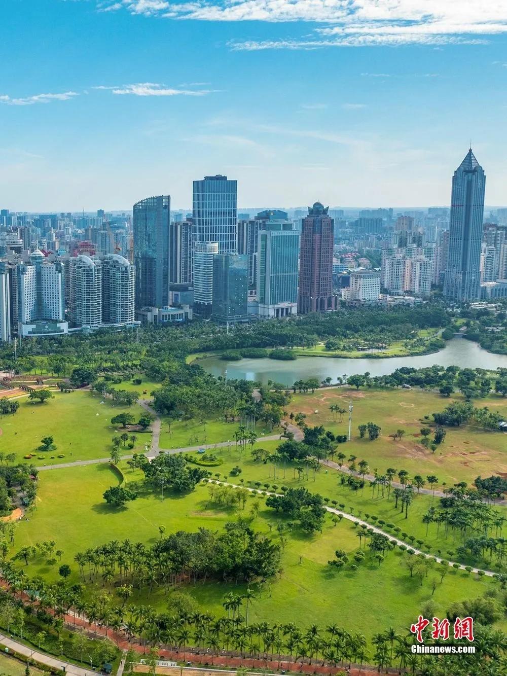 2025年11月21日,海南省海口市滨海大道楼宇和万绿园。骆云飞 摄 海南岛北部的海口湾 “椰风海韵,湾城融通” 湾内坐落着“城市绿肺”万绿园 草木葱茏、鸟语花香 假日海滩、西秀海滩依海相连 椰林婆娑,滩白沙净