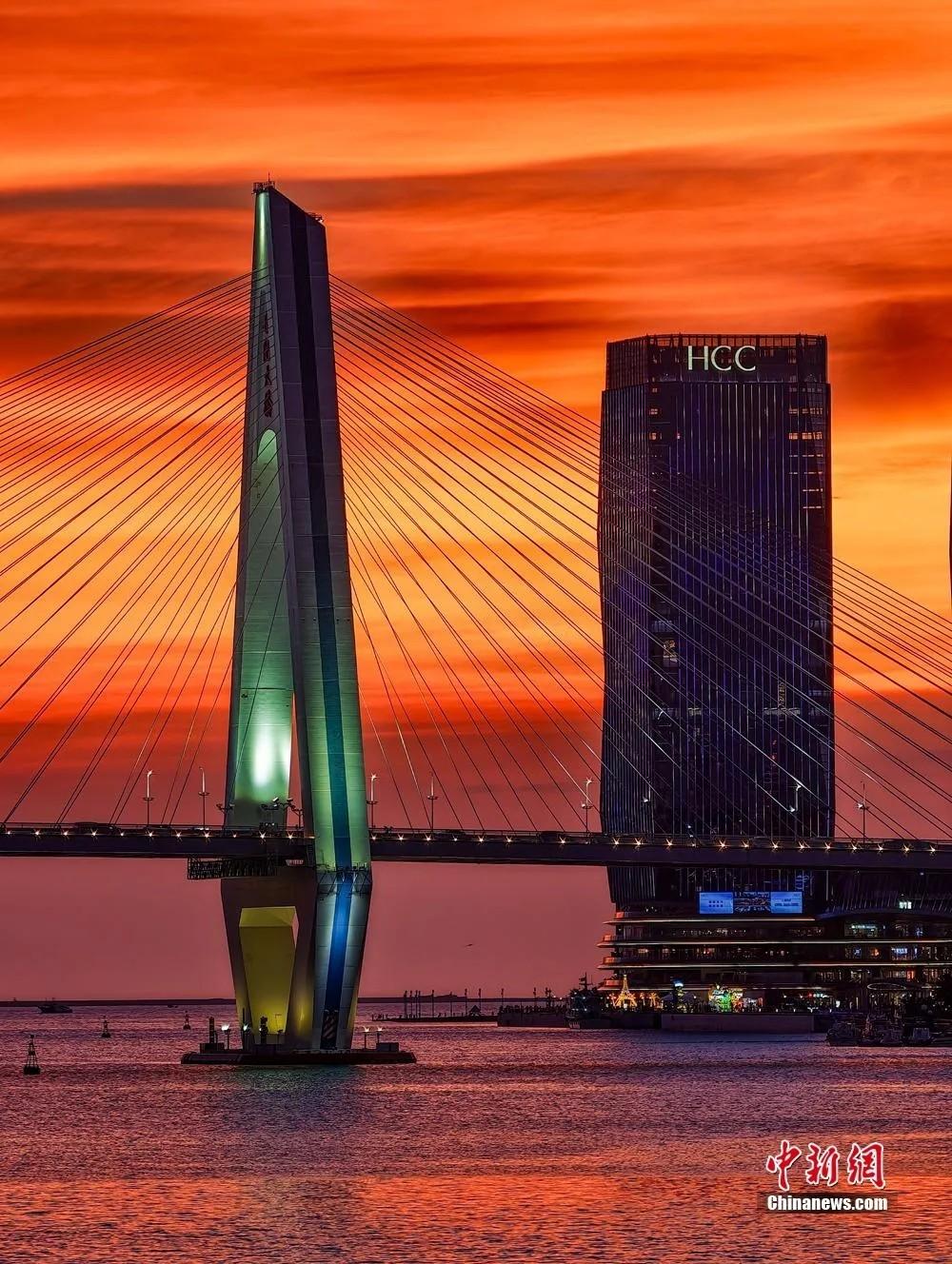 海口湾红霞漫天美如画。骆云飞 摄(资料图) “来海口,赴一场‘橘子海’之约” 海南省省长也为海口晚霞打call 每当夕阳西下 绯红的云彩倒映在海面上 随手一拍就是大片