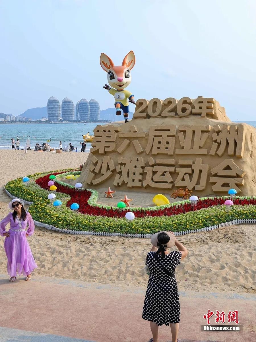 4月20日,第六届亚洲沙滩运动会的宣传标识与主题景观亮相三亚,吸引游客打卡拍照。骆云飞 摄 2026年4月22日 第六届亚洲沙滩运动会开幕? 这是亚洲最高水平的沙滩综合性运动会 也是亚奥理事会主办的 亚洲五大综合性运动会之一 还是海南封关后举办的首场国际综合性赛事 来自45个国家和地区 近1800名运动员 相聚三亚,逐梦亚沙?