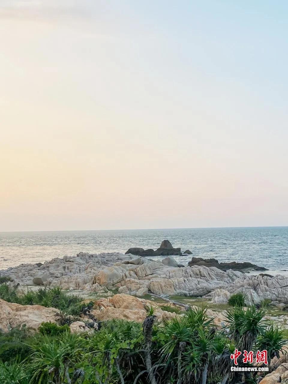 昌江棋子湾“棋子石”。昌江黎族自治县委宣传部 供图(资料图) 落日时分 海面波光碎金流转 和仙人掌、遍地礁石 相映成趣