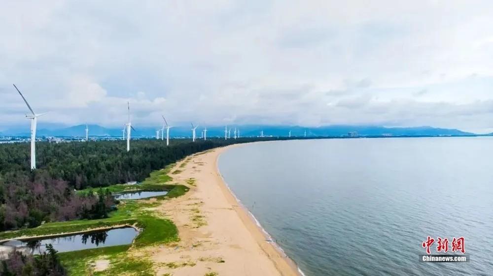 感城港湾。东方市融媒体中心 供图 湾内感恩角是我国领海基点之一 沿岸大风车 连绵排布,随风而舞