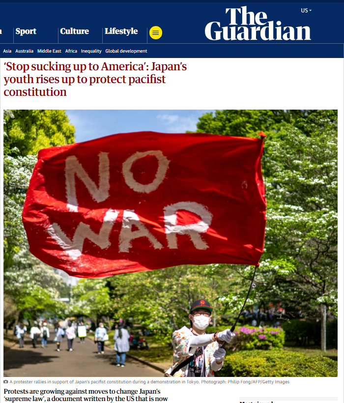 英国《卫报》报道截图 日本上智大学政治学教授中野晃一在文中分析,美国与以色列对伊朗的军事行动,以及美国总统对此反复无常的应对方式,已迫使日本年轻人发声。他指出:“这场战争让日本民众切身意识到,在高市早苗执政下,日本有可能介入一场非法的战争。因此,越来越多的人觉得,有必要表明他们对宪法第九条的支持,因为这是抵御战争的最后一道防线。”
