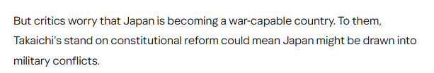 英国广播公司报道截图 文章还关注到,日本的防卫方针写入了1947年制定的二战后宪法。宪法明确放弃以战争作为解决国际争端的手段,并规定日本将永不保持战争力量。几十年来,和平主义已成为日本国家认同的一部分。但这一思维模式正在逐步转变。 文章认为,日本首相高市早苗一直支持修改和平宪法。虽然她尚未明确说明具体修改内容,但许多人认为这将涉及修改放弃战争的宪法第九条。批评人士担心日本正朝着成为一个具备战争能力的国家迈进。高市早苗在宪法改革问题上的立场可能意味着日本将介入军事冲突。