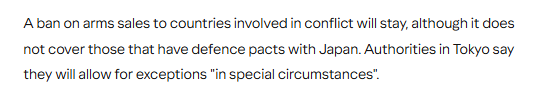 英国广播公司报道截图 文章分析称,此前将武器出口限制在救援、运输、预警、监视和扫雷这五类装备的规定将被取消。这意味着日本现在可以向包括美国和英国在内的17个与其签订防务协定的国家出售杀伤性武器。对参与冲突的国家实施武器出口的禁令将继续保留,但该禁令不适用于与日本有防务协定的国家。日本政府表示,将在“特殊情况下”允许例外处理。