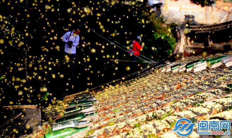 芳亭村打桂花的盛景,吸引摄影爱好者入村。 中国茶都安溪,隐藏着一个花香四溢的村落——“华东桂花第一村”虎邱镇芳亭村。这里桂花种植历史悠久,大大小小的桂花树上万棵,其中百年以上的桂花树168棵,高龄桂花树达4000棵。桂花品种主要有丹桂、金桂和云桂。 每到金秋时节,万株桂花竞相开放,芳亭村就举办“桂花节”打桂花活动。枝枝丫丫上挂满的金色小花,似满天星又如黄金伞,如雨洒落。浓郁的桂花香,打桂花、筛桂花、制花茶的热闹场景,松软的桂花糕、醇厚的桂花茶、香甜的桂花蜜,带来一场视觉、嗅觉、味觉的多重盛宴。 同时,百年桂花谷与周边的千亩稻田遥相呼应,形成“满山尽带黄金雨”的壮观景象,充分展示着秋收时节的大美画卷。 漳州华安县石井村 赏秋看点:千亩梯田 最佳观赏时间:10月-11月
